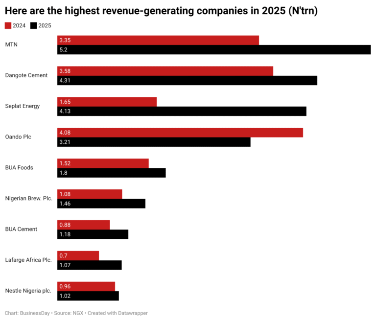 The three companies are now alongside industry leaders such as MTN Nigeria, which ranks first with revenue of N5.2 trillion, followed by Dangote Cement with N4.31 trillion, reaffirming its position as Africa’s largest cement producer. Seplat Energy also remained a major player, posting N4.13 trillion, supported by increased crude oil production and improved prices.