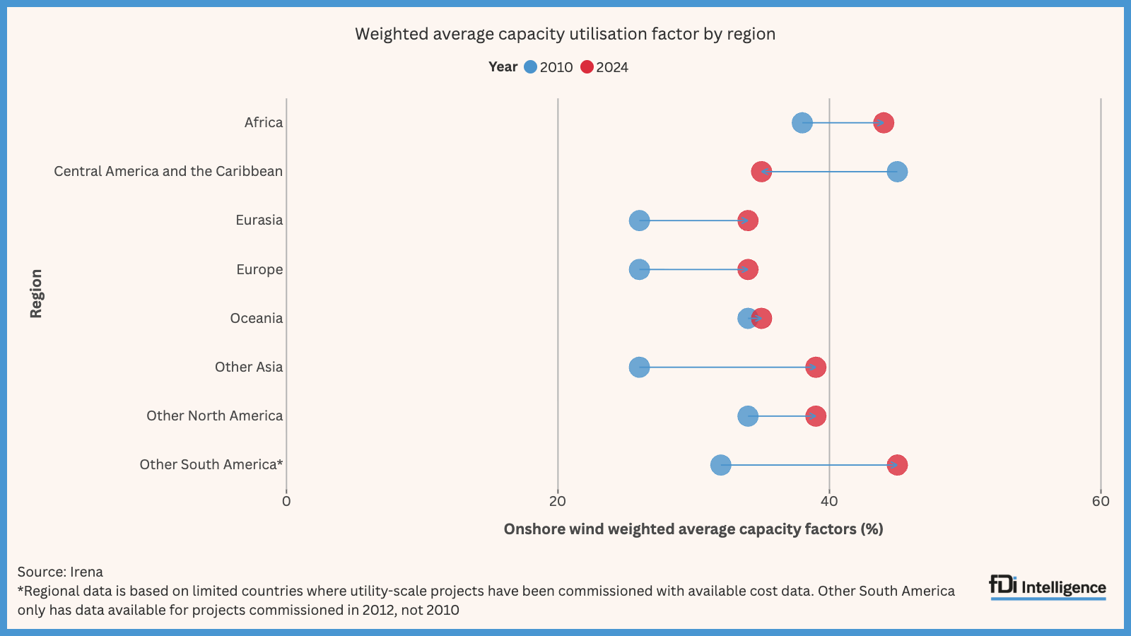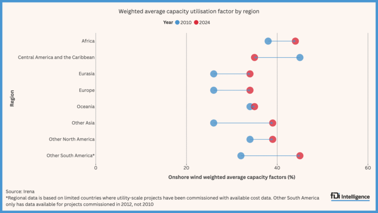 According to data from the International Renewable Energy Agency, the weighted average capacity factor for utility-scale onshore wind farms commissioned in Africa in 2024 was 44 percent, higher than the global average of 34 percent. This improved from 38% in 2010 and was on par with South America’s weighted average CUF of 45% in 2024.