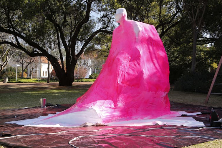 CR Swart sculpture preparation for “Plastic Histories” by Cigdem Aydemir, 2014. The work is being sprayed pink.