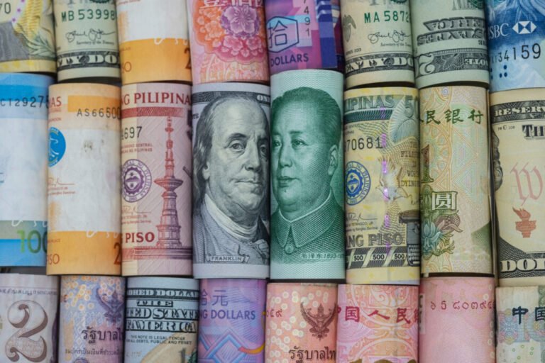 Image: US dollar and Chinese yuan banknotes with banknotes from multiple countries. It is a symbol of the tariff trade war crisis or unfair business between the world’s two largest economies.